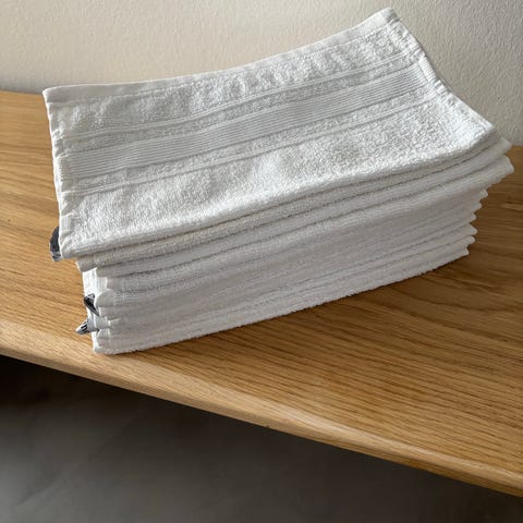 Hjemmelavet, hjemmestrikket i grå farve i bomuldsgarn. Målene er cirka 26/28 i bredde og længde. De krymper 5-10% i første vask.