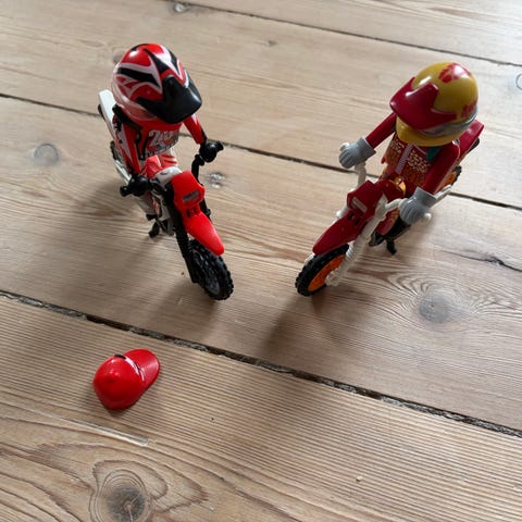 Vintage Playmobil legetøjssæt bestående af motorcykler i forskellige farver samt tilhørende figurer og tilbehør. Sættet inkluderer en rød gokart, en grøn motorcykel, en hvid motorcykel med farverige dekorationer, to figurer og en lille indhegning med dyr. Legetøjet er egnet til børn og kan bruges til rolleleg og fantasilege.