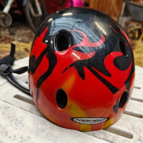 Met børnecykelhjelm i rød farve. Hjelmen har justerbare stropper og indvendig polstring, og kan justeres i størrelsen. Str. 46-53cm. God pasform. Ingen skader i hjelmen udover ridser udvendigt på toppen (se billeder).