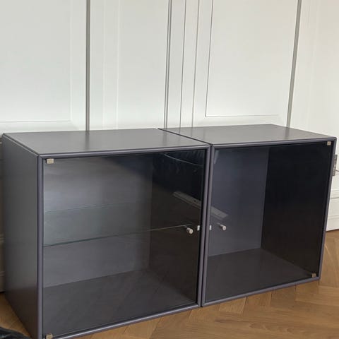 2 moduler med sokkel, som er blevet brugt som en samlet opstilling. Med skuffer, låge og åbne rum. Der er hul til ledninger i begge moduler, så kabler kan skjules bag reolen. Har nogle slidte steder, se billeder. Er mørkegrå.