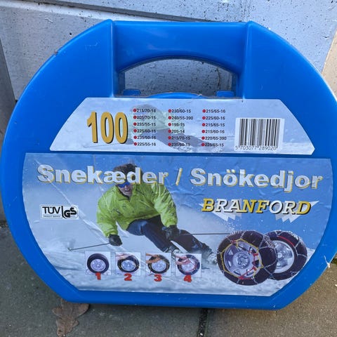 Branborg Snøkæder i størrelse 80. Kæderne er designet til at give ekstra greb på sne- og isglatte veje. Produktet leveres i en opbevaringskasse og indeholder kæder med metalkroge og gummidetaljer.