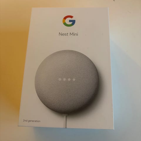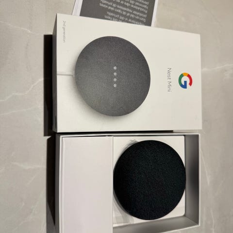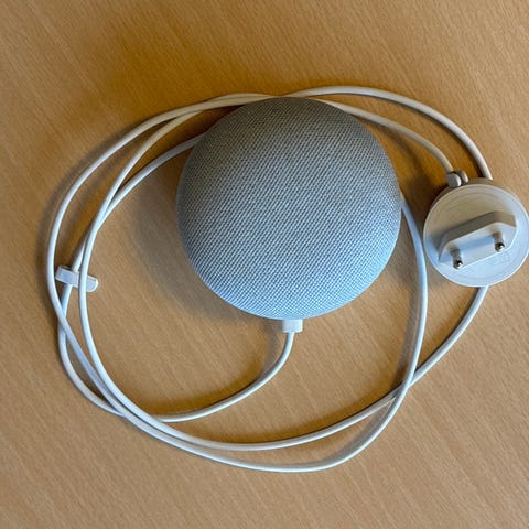 Google Nest Mini smart højttaler i mørkegrå farve. En kompakt enhed designet til stemmestyrede funktioner og musikafspilning. Indeholder strømforsyning med dansk stik.