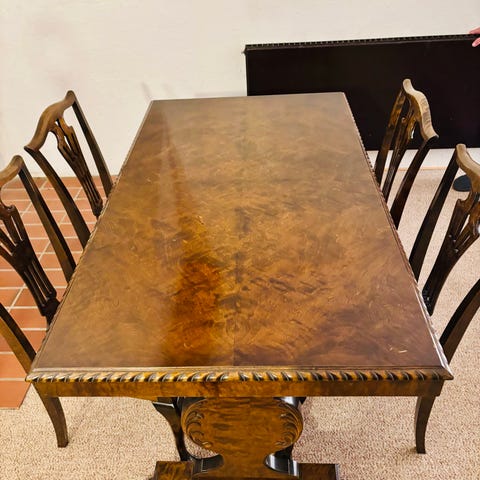 Stolene er i virkelig fin stand og 2 af dem har armlæn og polstrede sæder med mønstret stof. Bordet har en klassisk finish og kan bruges til spisestue eller opholdsrum.