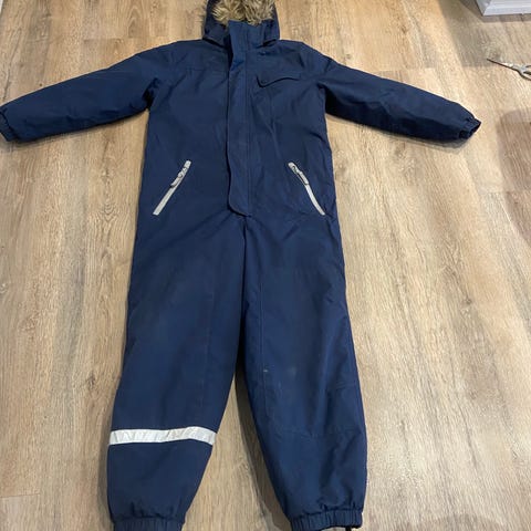 Blå flyverdragt i størrelse 80. Flyverdragten har en aftagelig hætte med pelskant og fleecefor indvendigt. Den er designet til at give varme og beskyttelse mod kulde.