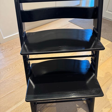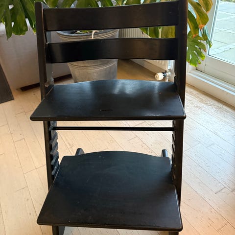 Stokke højstol i sort træ. Højstolen er designet til børn og har justerbare trin for at tilpasse sidde- og fodstøtte. Materialet er træ, og farven er sort. Standen er fin med mindre brugsspor