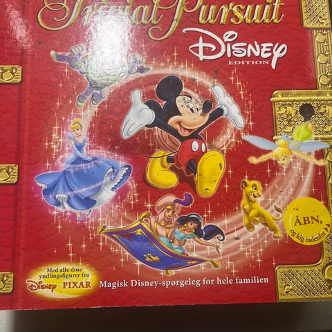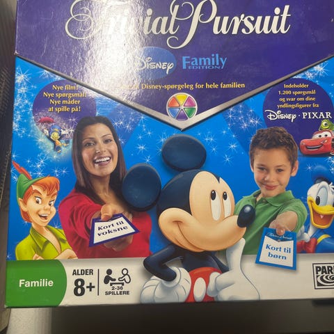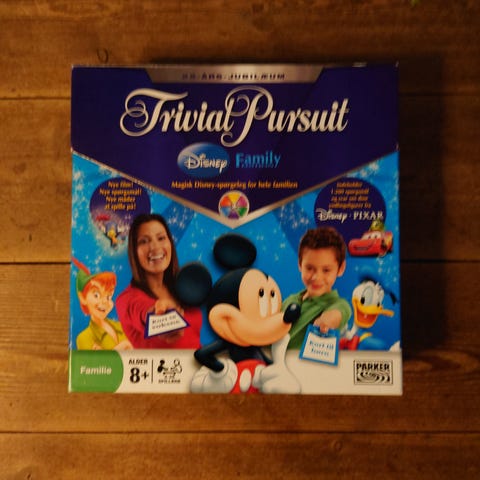 Trivial Pursuit Disney Family brætspil med Disney-tema. Spillet indeholder spillebrikker, kort, og spilleplade med Disney-motiver. Egnet til familiebrug og anbefalet alder 8 år og op.
