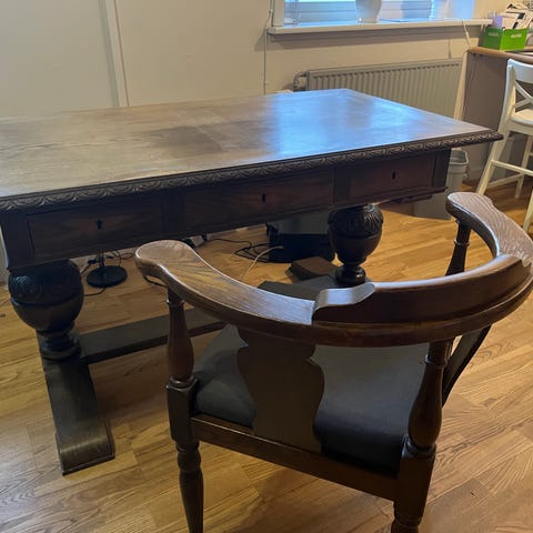 Antikt skrivebord lavet af træ med drejede ben. Bordet har en rektangulær bordplade og en enkel, klassisk stil. Velegnet til brug som skrivebord eller dekorativt møbel.