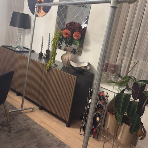 Hjemmebygget tøjstativ lavet i træ og sorte metalrør.