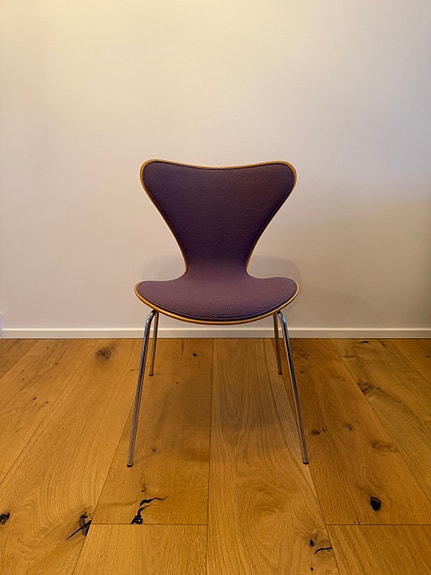 Et par 7er stole elegant polstrede i cognac læder med fast ryg samt ben af krom og med ny siddehøjde på 47cm