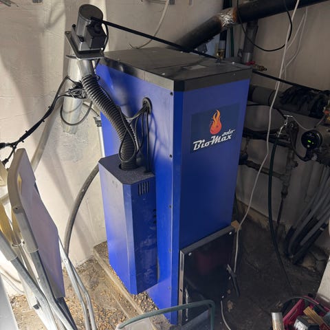 Velfungerende pillefyr med integreret brændselstank og kontrolpanel til nem styring. Perfekt til økonomisk opvarmning med træpiller.