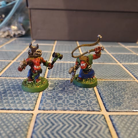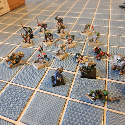 Warhammer figur sæt med flere detaljerede miniaturemodeller. Sættet indeholder en stor artillerikanon med støttefigurer, alle monteret på firkantede baser.
