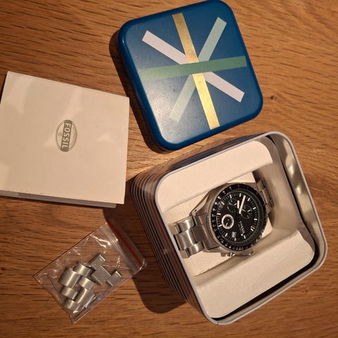 Fossil herreur med metalrem og sort urskive. Uret har kronograf-funktioner og en klassisk, robust udformning.
