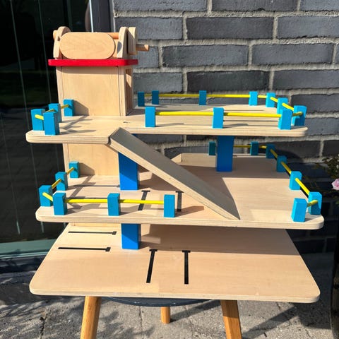 HAPE Legetøj Parkeringshus i træ med flere etager og ramper. Designet til børn og egnet til leg med biler og køretøjer. Indeholder parkeringspladser, helikopterlandingsplads og detaljerede veje.