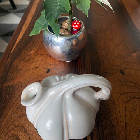 Skøn,klassisk,dansk keramik-kande. Kanden/vasen er fra Michael Andersen på Bornholm. Kanden er formet som en fisk med detaljer. Velegnet som kande og fungerer fint som vase. Mål: H 11 , L 14 cm. Pris 500,-