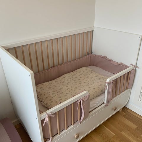 Fejler ikke noget. Billedet er ikke tydeligt da den i øjeblikket er for enden af vores seng pga plads mangle, men i er velkommen til at kigge forbi. Madras medfølger og købt i babysam. Sengen mål 60x120