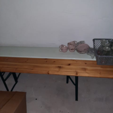 2 borde bænkesæt sælges kan slås sammen så de ikke fylder noget målene er