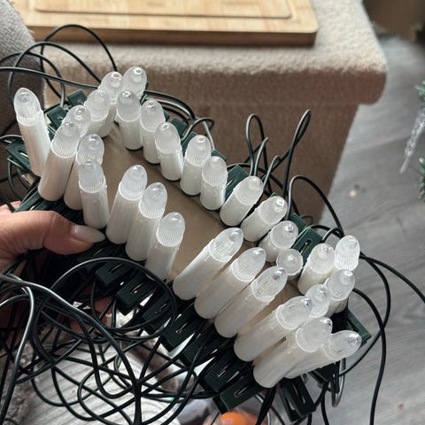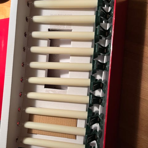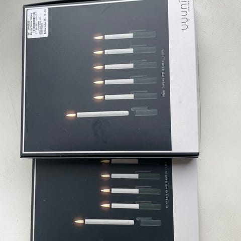 Pakke med 4 hvide lys og 4 messing farvet clips.