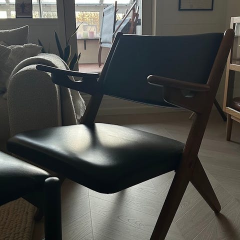 Hans Olsen stol i mørkt træ og nappa, fin men har et par små afslag i finer … Gammel og fin stol, der står helt originalt.. tror den er fra tresserne…