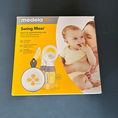 Medela Swing Maxi Flex brystpumpe elektrisk i gul farve. Pumpen leveres med tilbehør til brystmælkssamling og opbevaring. Designet til at lette amning og mælkedrikning for mødre.