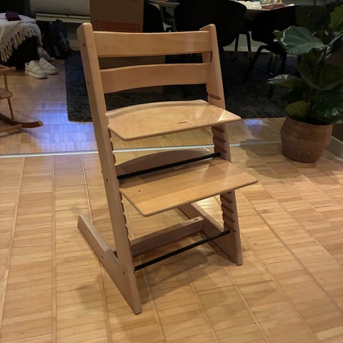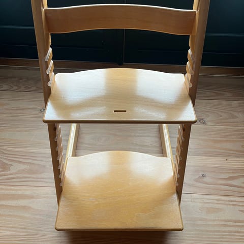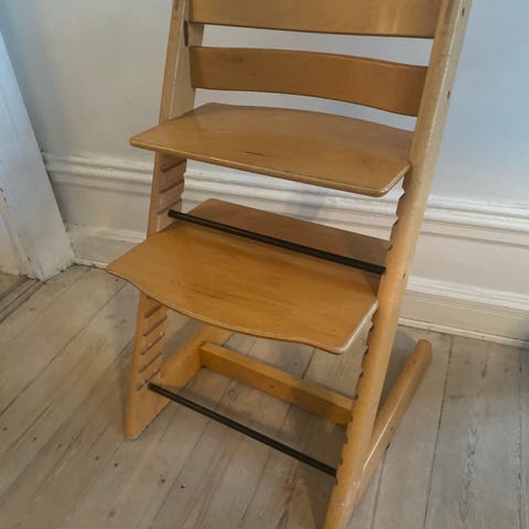Stokke højstol i træ. Højstolen er designet til børn og har en robust konstruktion i træmateriale. Den har en justerbar fodstøtte og sæde med ryglæn for støtte og komfort.