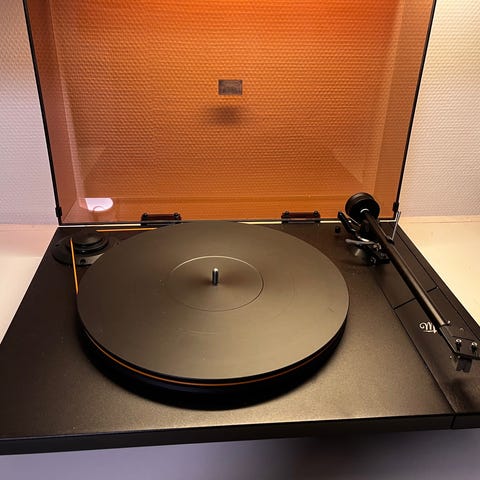 Super pladespiller med ekstra pladetallerken og beskyttelseslåg. Monteret med Strogi S arm. Sælges uden pickup.