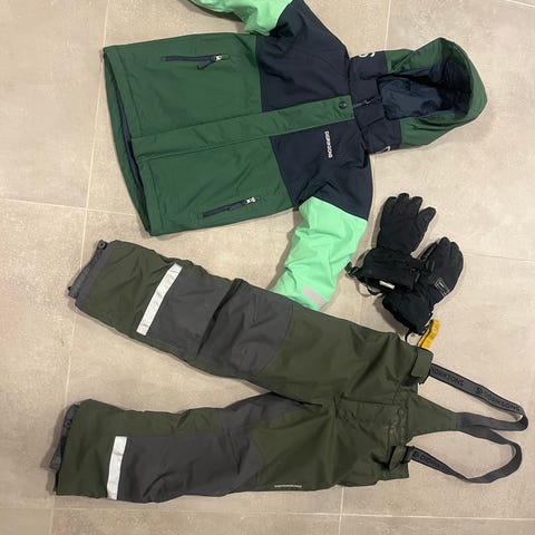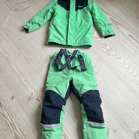 Didriksons skisæt til børn i størrelse 110. Bukser og jakke er unisex og lækker kvalitet. Jakken er mørkeblå og bukserne sorte.