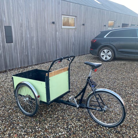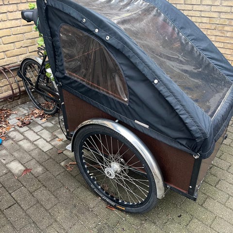 Christiania Light. 7 gear. Kører fint. Er spændt op og smurt. Har fået nye bremse kalibere, ny kaleche, ny ringeklokke. Reelight baglygte. Gummi bund. Børnesæde. Goskendt fastmonteret lås med 2 nøgler og extra kædelås med 3 nøgler. Stelnr - CS54697D.