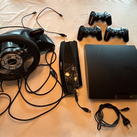 PS3 super slim 12 gb, 1 original trådløs controller, 9 spil samt kabler. Virker perfekt