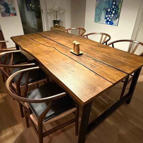 Meget flot og velholdt Kristensen & Kristensen plankespisebord i massiv egetræ (4 cm) med flotte stålben.