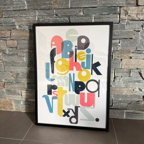 Indrammet plakat med geometrisk motiv bestående af hexagoner og bogstaver i forskellige farver. Plakaten er monteret i en sort ramme og kan anvendes som vægdekoration.