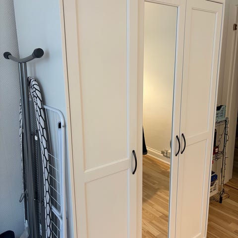 Garderobeskab med Bøjlestang og hylder. Fremstår pænt, spejl uden skader. Adskilles nemt til transport eller kan bæres som stel
