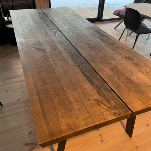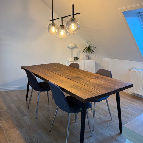 Jeg sælger dette massive plankebord det er lige blevet professionelt slibet og fået oile så det står som nyt. Målene er 150×90 mærket er Vintage KBH.. har også 4 spise stole af mærket normann sorte stole med valnød træsort ben. Pris 1300kr per stk står også flotte