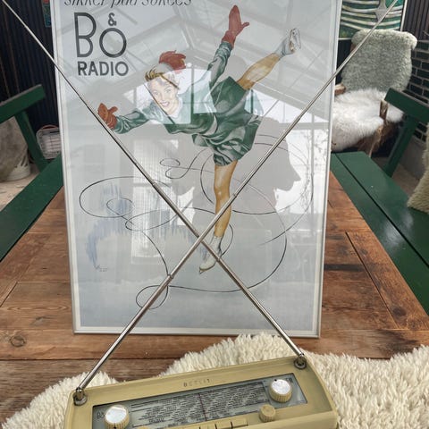 Sandfarvet/ sort B&O transistor radio med ledning, og lys gul med sølv til batterier.