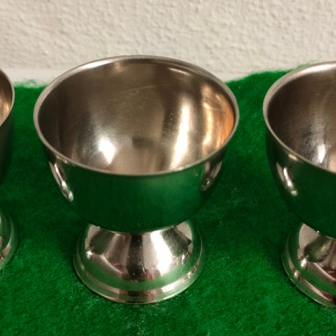 3 fine, klassiske æggebægre i rustfrit stål. “ Stainless steel, Denmark”.