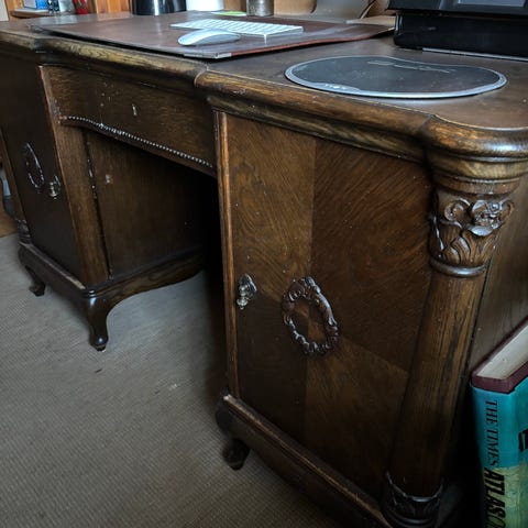 Antikt skrivebord med udskæringer og intarsia i træ. Skrivebordet har en klapfunktion med rød filt på skrivefladen samt flere små skuffer til opbevaring. Dekorative metalbeslag pryder hjørnerne. Møblet er velegnet til opbevaring og skrivearbejde i hjem eller kontor.