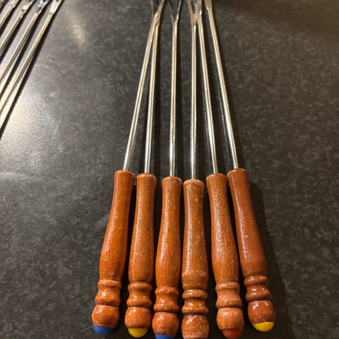 6 stk fondu gafler. Rustfri. Håndtag er ( tror jeg ) teak træ på 3 af siderne. Og på sidste side en plade med et terning nr. meget flotte og velholdte.