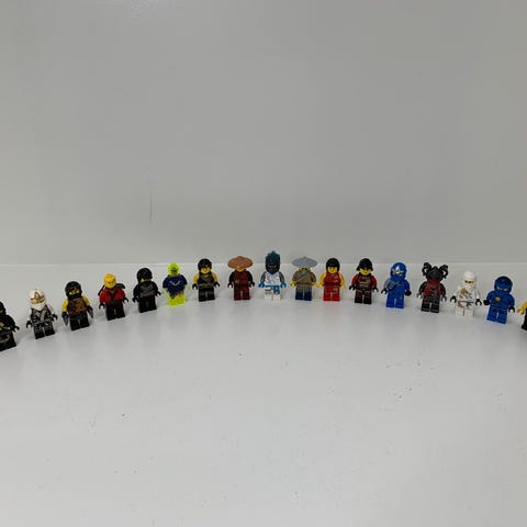 LEGO NINJAGO minifigurer i forskellige farver og designs. Sættet indeholder flere minifigurer, der kan bruges til leg eller samling.
