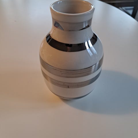 Kähler Vase med dekorative sorte og hvide striber. Vasen er i keramik og har en rund form med en bred åbning. Den er egnet til brug som dekoration eller til at holde blomster.