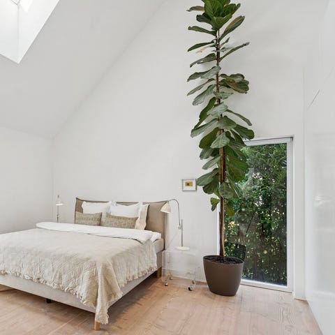 2.25 meter høj opstammet violinfigen med grønne blade i en stor beige keramik krukke. Planten har en høj kraftig stamme og brede blade, velegnet til indendørs brug som dekorativ plante.