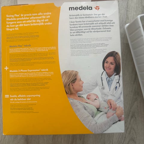 Medela Flex Swing elektrisk brystpumpe. Det medfølger brysttragt i størrelserne 21 og 24 mm. Pumpen er brugt kortvarigt i et forsøg på at genoprette produktionen. Tragten og flasken er steriliseret efter brug.