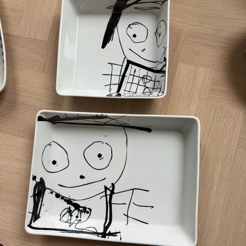Paul Pava tallerken/serveringsfade med tegnet motiv, 2 stk. Fade er rektangulære med farverige tegninger i sort, blå og pink.