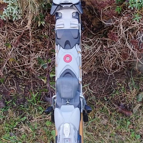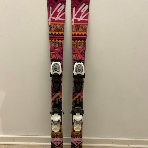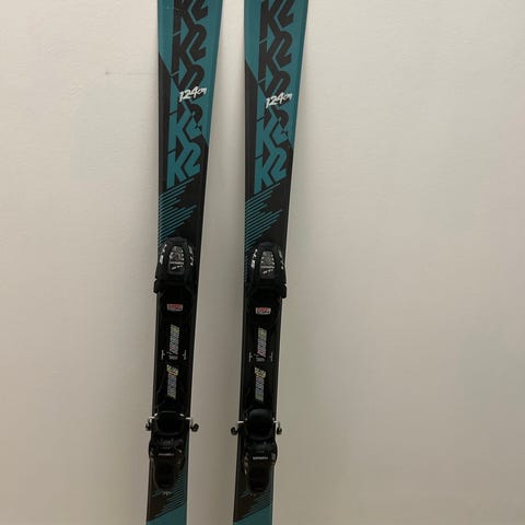 K2 ski med tilhørende bindinger. Skiene har et mønstret design i sort, hvid og blå nuancer. De er egnet til skiløb og kommer med monterede bindinger for fastgørelse af skistøvler.