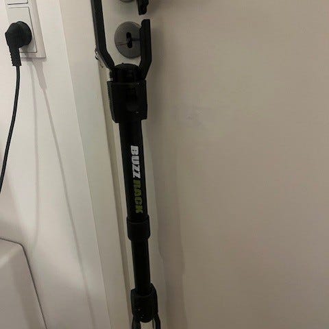 Buzz Rack cykelholder med justerbar længde og sort farve. Designet til montering på bil for transport af cykler. Fremstillet i metal og plastmateriale.