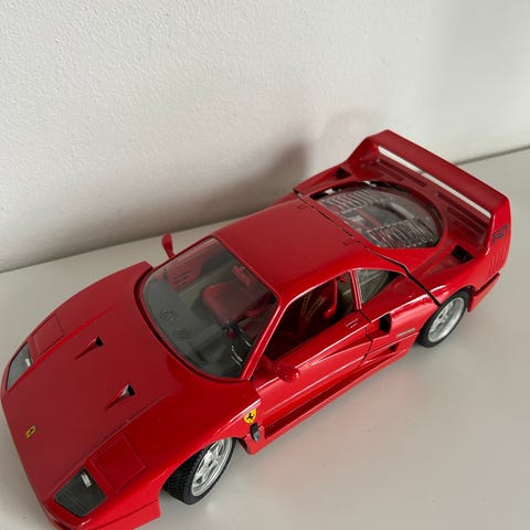 Ferrari F40 modelbil i rød farve med detaljeret motor og interiør. Modellen har åbningsbare døre og motorhjelm, der viser motorens indre mekanik. Velegnet til samling eller udstilling.