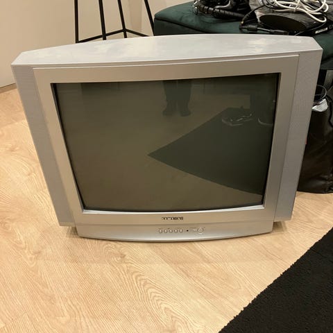 kan stå på et skrivebord. Har indbygget vhs afspiller. Vhs er ikke testet i nyere tid men tv'et fungerer fint. Universal fjernbetjening medfølger. Har scart og composit indgange.