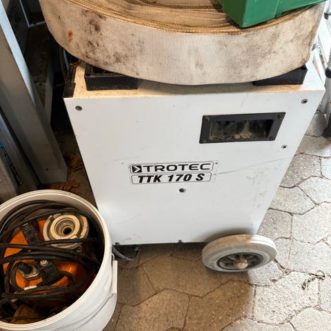 Trotec TTK 140 S affugter med hvidt kabinet og hjul til nem mobilitet. Designet til effektiv fugtkontrol i forskellige rum. Den fungerer perfekt, men vi har ikke brug for den længere.