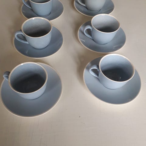 Lyseblåt Aluminia kaffekopper x 3sæt i serien Sonja. Det er patineret og har synlige brugsspor som igennem de sidste knap 100års brug. Det har derved sjæl og charme. Afhent i Køge eller sendes. Tlf 40500544