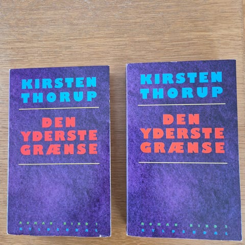 Den yderste grænse (Bind 1-2), Kirsten Thorup, genre: roman, 2 pæne indbundne bind med smudsomslag, Gyldendals Bogklub, 1988, 706 sider.