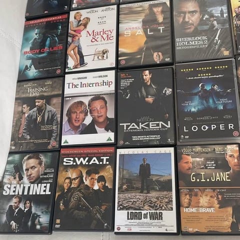Samling af 23 DVD-film med titler som The Recruit, Felon, Parker, Face/Off, Ocean's Twelve, Salt, Paycheck, Babylon A.D., Fast & Furious 6, A-Team, Taken 2, The One, Hitman, og flere. Filmene er primært inden for action- og thriller-genren.