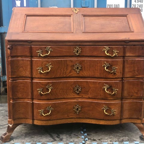 Chatol/kommode i træ med mange store og små skuffer både synlige og med skjulte skuffer og rum. En plade kan hives ud til et skrivebord (chatol) eller skubbes ind (kommode). Møblet er i fin stand, men små reparationer kan gøres f.eks en liste og en knop på en skuffe.
